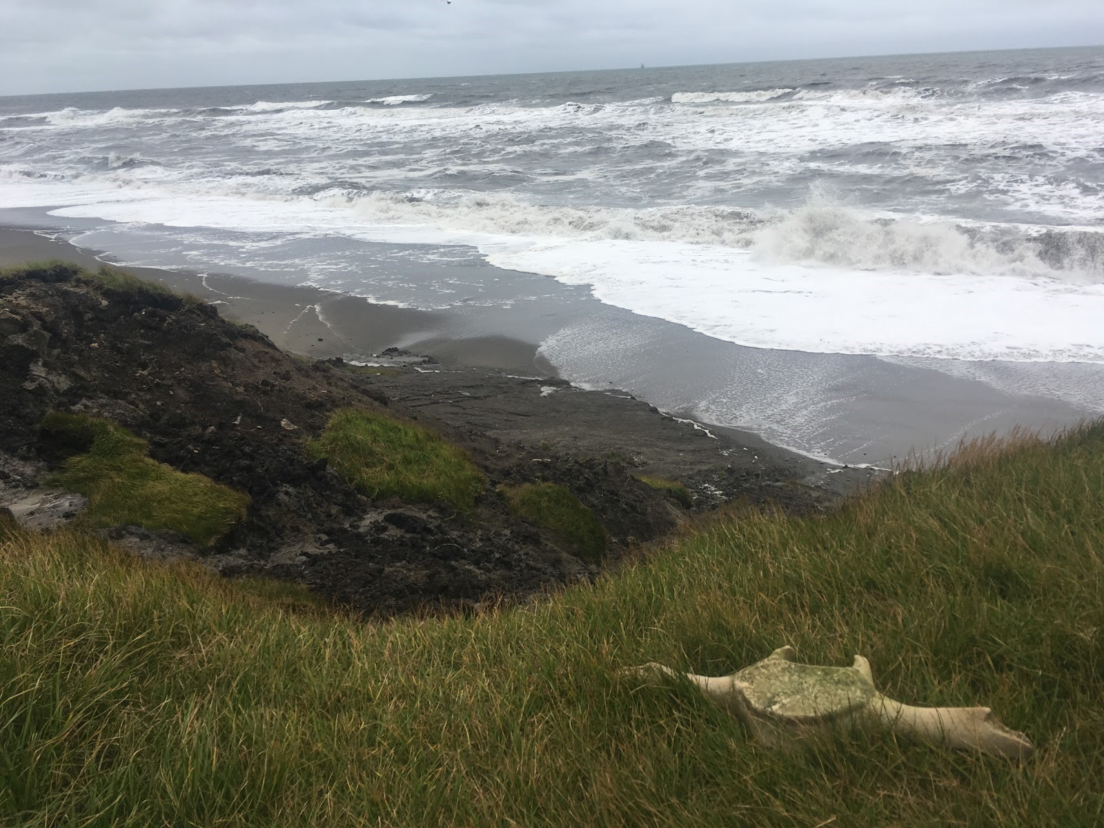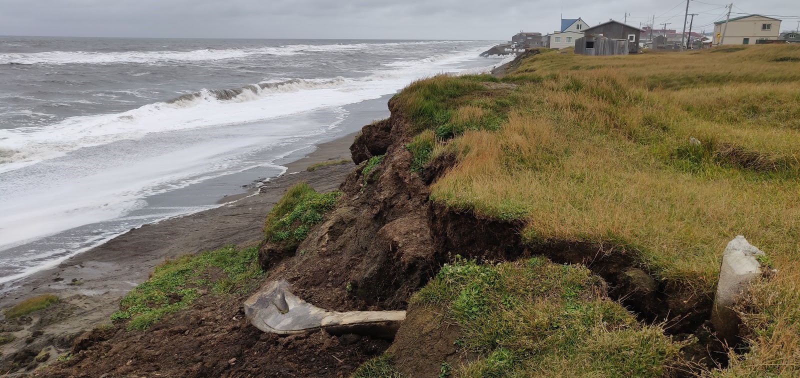 The waves also were eroding a heritage site just west of town, where 2,000 years of history lies buried in the hummocky remains of sod houses. But the site is vanishing. As we walked to the edge of the bluff, we saw bowhead whale ribs and jawbones protruding from the turf. And where the bluff had collapsed, numerous bones and artifacts were washing down to the beach to scatter in the surf.