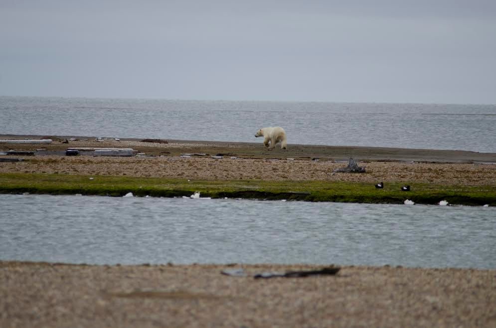 While we were watching the guillemots, we also saw other ice refugees on the island. For four days running, we saw polar bears resting and meandering, at times close enough to give us pause. Since the early 2000s, due to disappearing sea ice, polar bears have taken up summer residence on the barrier islands of the Beaufort Sea, including Cooper Island. The bears wait for sea ice to reform, so they can return to the seal hunting that sustains them.