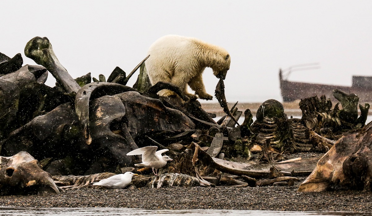 The Inupiat share their whale meat with the polar bears, something they have done for many years. This gesture provides much needed food for polar bears, especially as they spend longer periods of time on land due to the receding sea ice. When I visited Kaktovik in 2016, my most memorable photo is of a cub on top of whale bones, shaking what looks like animal skin in its mouth.