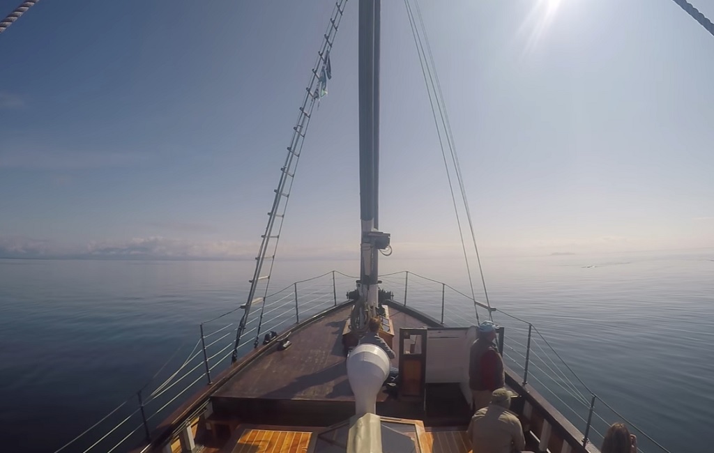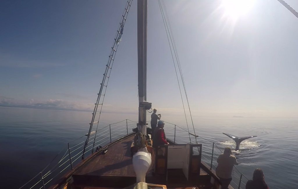 Our only real plan for that day was to anchor in the evening somewhere at Admiralty Island or Baranof Island. We didn’t have any concrete plans for the day. Having an itinerary means you have to get somewhere, and when nature presents something beautiful and awe inspiring to enjoy, an itinerary means you just have to put on your blinders and keep going. So there we were, sitting around listening to whales. We’d also dropped a hydrophone (an underwater microphone) over the side. The small amplifier on deck that the hydrophone was plugged to revealed all kinds of whale sounds from funny-bawdy to ethereal. From my spot on deck, I could see couple of whales surfacing about a quarter mile away. It soon became evident that they were heading our direction. Everyone on deck turned their attention to these whales. They moved in a straight line. We watched. Each time they broke the surface, they were closer. Soon, one whales was close enough to see it under water – its long pectoral fins faintly glowing against the deep dark water. Over the amplifier, a couple barking sounds and some bubbles could be heard. Then a few seconds later, a whale surfaced just off our starboard side. It lifted it’s fluke high and dove under the boat. Farther aft, the second whale surfaced and dove as well. There was a moment of joy, then wonder. I wondered why they chose that path? Where were they going? What did the sounds mean? How long would they remain under water? Where would they surface next?