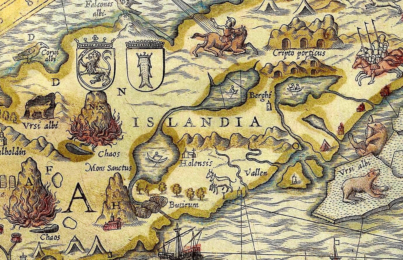 Though Magnus clearly labeled the bears on the Carta Marina as ursi albi, artisans who finished copies of the map colored them according to their own whims, sometimes in the more familiar brown of European bears. The Carta Marina’s three bears are most certainly polar bears, however, since no brown bears lived in Iceland (Islandia). The inland bear is portrayed inside a cave or den, although polar bears most likely never hibernated in Iceland. Only pregnant females of this species truly hibernate, but, historically, Iceland never had a breeding population.