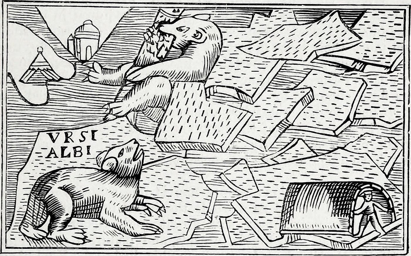 In his 1555 travel guide “Historia de Gentibus Septentrionalibus” (Description of the Northern Peoples), Magnus describes hunters donating white bearskins to the high altar of Trondheim cathedral in Norway, “so that during a period of dreadful cold the celebrant priest should not suffer frozen feet.” The bearskins probably came from Iceland or northern Norway. One of the bears on Magnus’s map, an image recycled to head a chapter in “Historia,” shown here, chews on a fish. Tellingly, that chapter is titled “De Ursis Piscantibus,” or “Of Fishing Bears.” This foraging mode was, and still is, believed to be common, though polar bears mostly hunt seals.