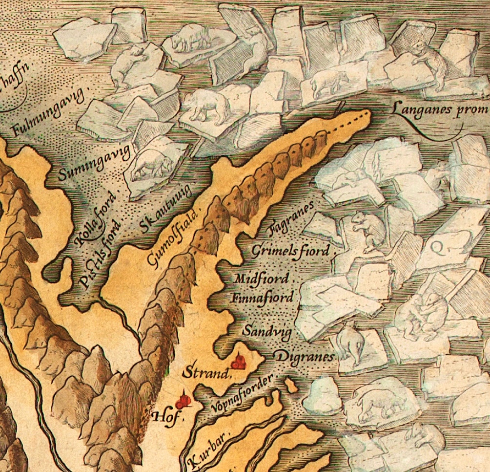 A 1590 map of Iceland by the Flemish cartographer Abraham Ortelius – who was also the first person to intuit continental drift – explains how polar bears got to Europe’s second-largest island, and still do: on sea ice floating southward and eastward from the pole, skirting Greenland’s north coast. The map’s legend provides details: “Huge and marvailous great heaps of ice brought hither with the tide from the frozen sea, making a great and terrible noise; some pieces of which oft times are fourty cubites bigge; upon these in some places white beares do fitte closely.” Although Icelanders quickly killed most of the marooned bears because they threatened their sheep flocks, they occasionally captured and traded orphaned cubs, or gifted them to European royalty, to be kept in private menageries.