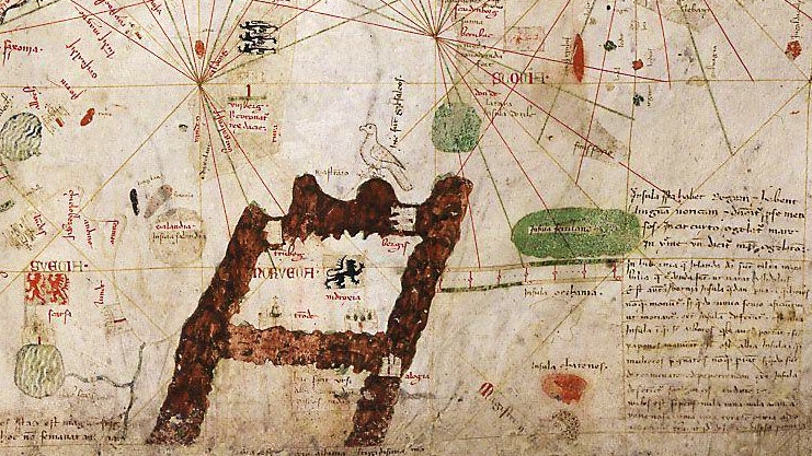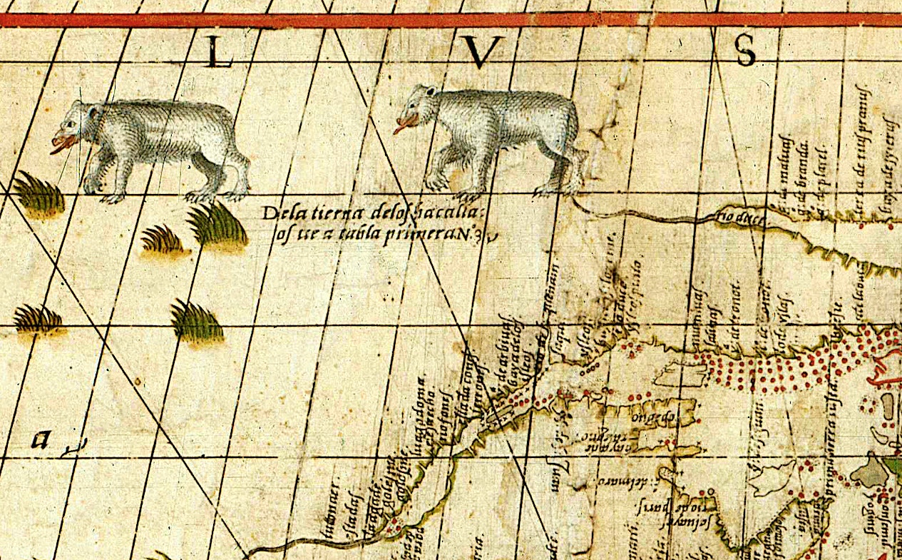 Statements about white bears in northern Norway can also be found on Angelino de Dalorto’s 1339 portolan, shown above, and on several later maps. Portolans are navigational charts used in the late Middle Ages that showed only ports and coasts in detail. As an emigrant from coastal Italy to Majorca, Spain, Dalorto cared more about port towns and marine highways than their terrestrial equivalents. “Here are the white bears and they eat raw fish,” he remarked about Norway. Dalorto imagined Norway as a square, as shown here outlined in brown, and the text referencing polar bears sits just north of it. Unfortunately, no animal image comes with the annotation.