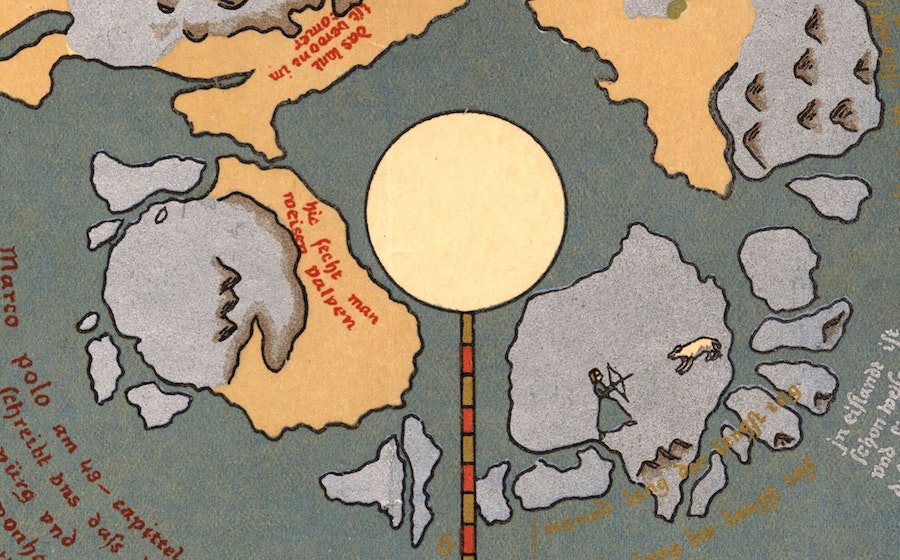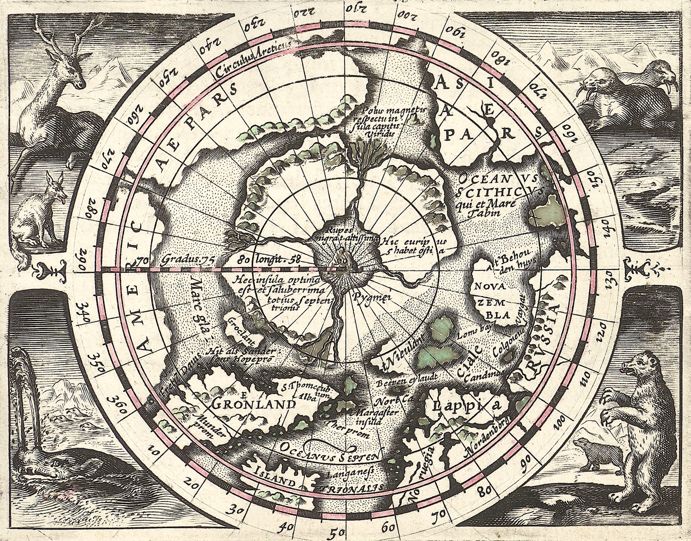 Regiones Hyperboreae is a pole-centered 1616 map by the Flemish theologian, historian and cosmographer to the court of Louis XIII, Petrus Bertius. Its bear in the margins rears up on hind legs – a most impressive posture – and, like the walrus, is rendered realistically compared to the map’s whale, reindeer and wolf or Arctic fox. While biological knowledge gained from captive white bears had improved, the Arctic’s geography still held big secrets. On the Bertius map, a polar sea rumored to be ice-free year-round lies enclosed by a landmass dissected by four narrow channels. This fiction endured. In 1860, the American physician Isaac Israel Hayes tried to break through a bulwark of pack ice in search for this open stretch. And as late as 1913, the American Museum of Natural History sponsored an expedition to find Crocker Land, a huge island Robert Peary claimed to have sighted in 1906, but which did not exist.