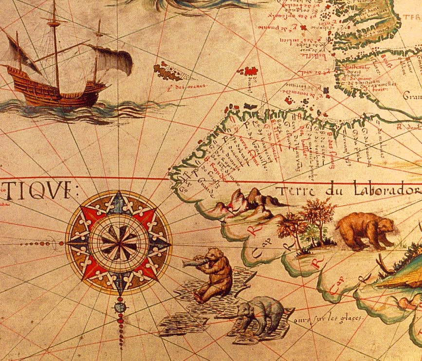Pierre Desceliers’ sprawling and teeming 1550 mappamundi, or world map, positions fish-eating bears in Labrador, eastern Canada. Desceliers belonged to a group of chart makers in Dieppe, France, who broadcast French and Portuguese conquests in the New World through their maps. The color of these bears is off, but a few clues indicate they are most likely polar bears. First, the area is treeless tundra into which eastern Canada’s grizzly bears rarely, if ever, venture. As well, two of the three bears frolic on ice floes, which grizzlies reportedly never do.