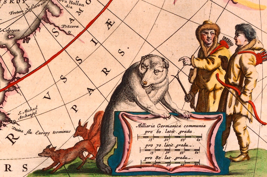 With a growing body of knowledge from whalers and walrus hunters sailing the Arctic, depictions of the more northerly latitudes and their inhabitants became increasingly accurate. However, the newer maps also reveal distortions. In a cartouche on the Dutch atlas maker Willem Janszoon Blaeu’s map Regiones Sub Polo Arctico from circa 1635, the dress, weapons and faces of two Indigenous hunters suggest Ottomans and might have been modeled on these “savage” archers. Their polar bear counterpart appears wolf-like.