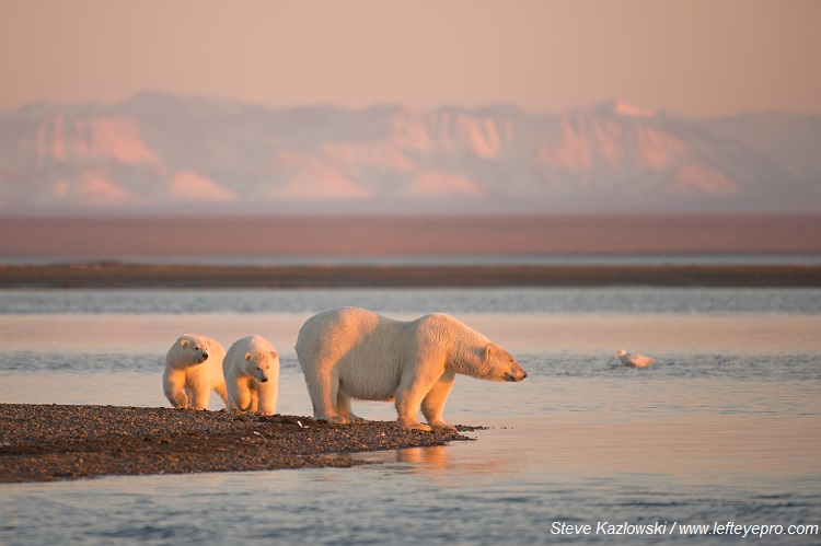 Polar bear mother with cubs travel the Bernard Spit along the Coastal Plain of the Arctic National Wildlife Refuge, with the Brooks Range in the distance. Photo: Steven Kazlowski