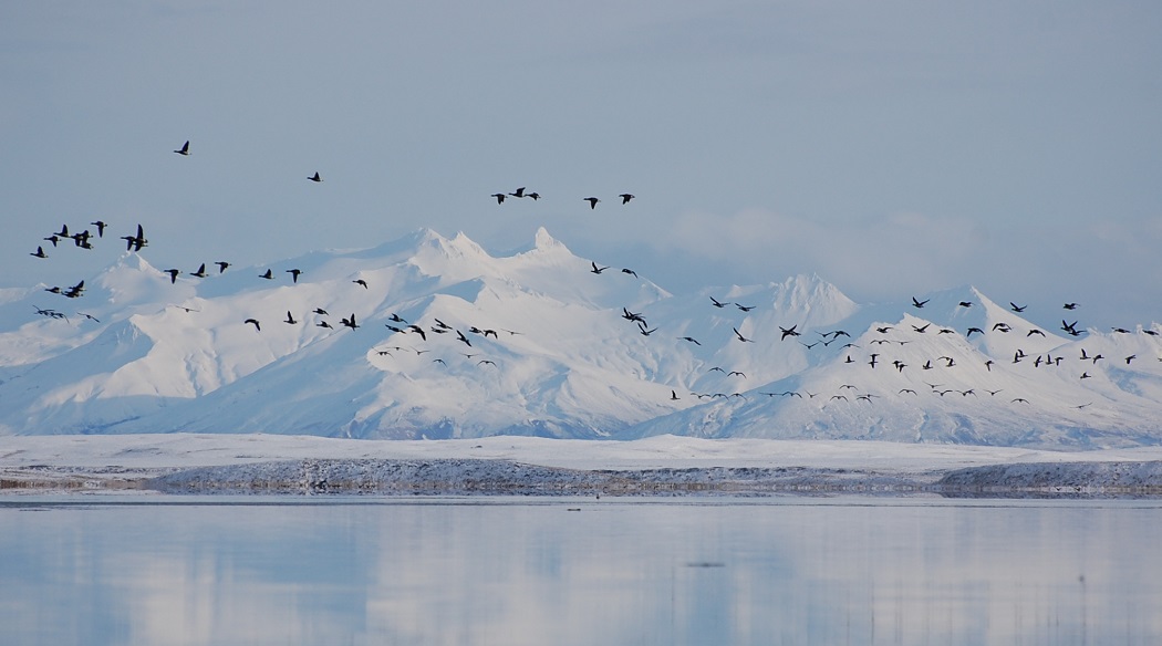 Pacific black brant fly over Izembek Lagoon in the Izembek National Wildlife Refuge. (U.S. Fish and Wildlife Service – Alaska)