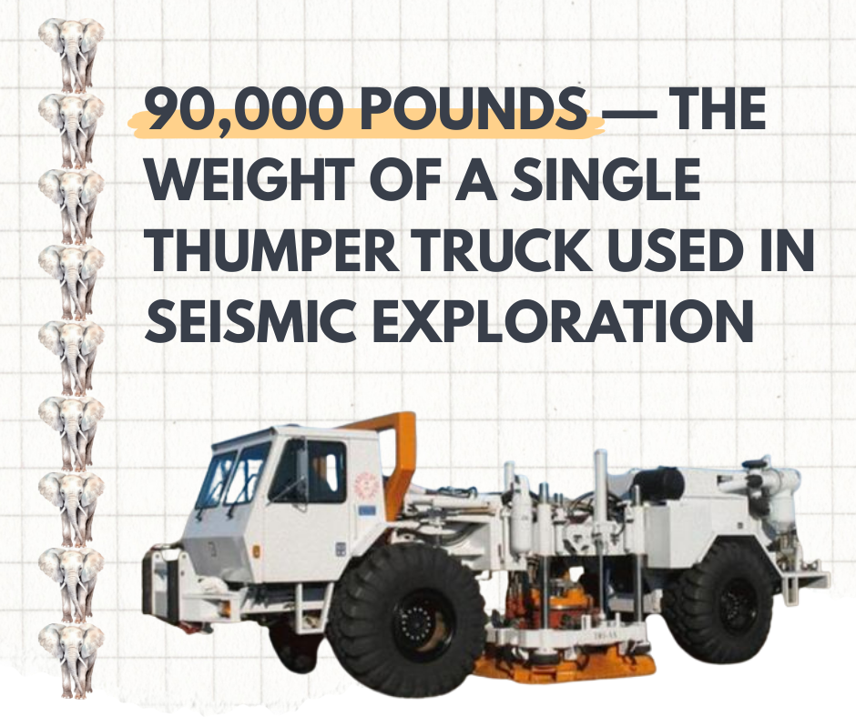 To figure out where to drill, companies send dozens of 90,000-pound “thumper trucks” along with a convoy of bulldozers and support vehicles rumbling across the fragile tundra. That’s like driving a truck that weighs the same as roughly nine elephants across fragile permafrost and ice—it’s a recipe for destruction. Each truck thumps a giant metal plate on the ground, sending sound waves deep below the surface, where they bounce back to create a map of underground oil reserves.