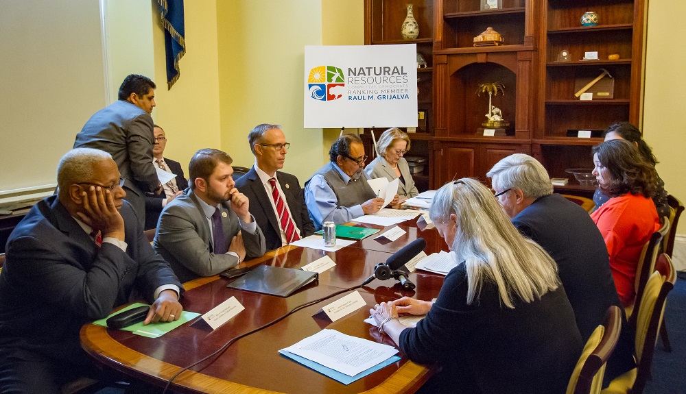 Donetta Tritt (top right) of the Gwich’in people is joined by Rebecca Goodstein of Patagonia, former Deputy Secretary of the Interior David Hayes and Defenders of Wildlife president Jamie Rappaport Clark. Across the table: Rep. Niki Tsongas (D-MA), Rep. Raul Grijalva (D-NM), Rep. Jared Huffman (D-CA), Rep. Ruben Gallego (D-AZ) and Rep. Donald McEachin (D-VA).