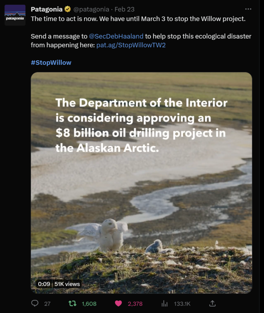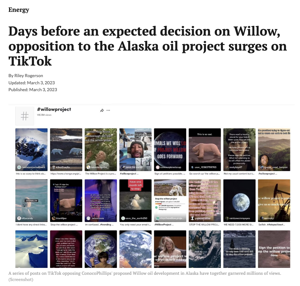 In just the past week, supporters all over the country have helped the #StopWillow campaign “go viral.” As of March 8th, across social media platforms, hashtags related to #StopWillow have more than 650 million views, helping to drive nearly 5 MILLION petition signatures across campaign partners.