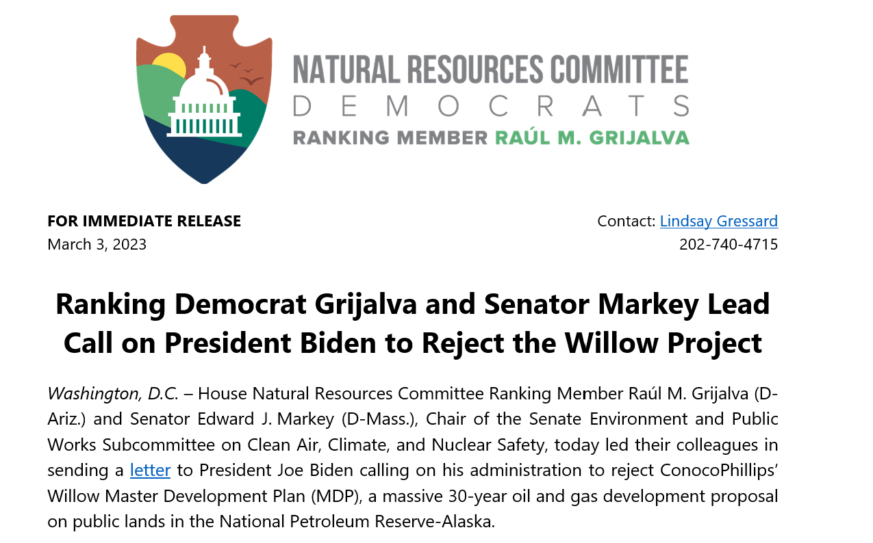 And while this viral social media has piqued significant media and lawmaker interest, #StopWillow’s unprecedented public awareness has extended beyond social media to Congress, major news outlets, the Department of the Interior and on-the-ground rallies. This moment comes on the heels of weeks of strategic planning, coalition efforts, partner promotion, 3x weekly rapid-response calls, local outcries, and urgent actions. It’s taken not just a village, but a country to raise this issue to the top of the ranks.