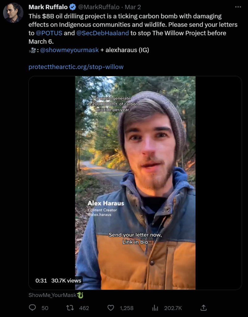 What the coalitions, content creators, and activists all understand is that the climate impacts from Willow would be massive, potentially putting out of reach President Biden’s climate commitments. And missing those targets will make it increasingly difficult to keep warming below what scientists say is necessary to avert the worst effects, putting our future at risk. The Willow Master Development Plan is the single largest oil extraction project proposed on public lands today and if approved, would emit pollution over its 30-year lifespan equivalent to 76 coal-fired power plants running for a year. It’s no surprise that such a consequential decision shouldered its way to the top of social trends this week.